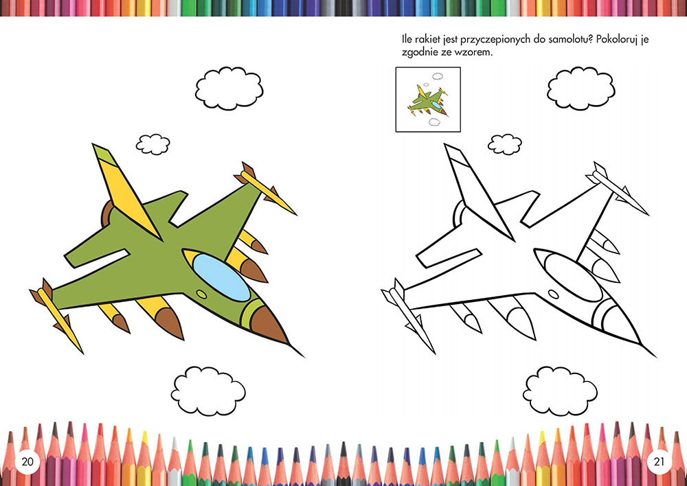 Do ka¿dego rysunku dodany jest kolorowy wzór do na¶ladowania oraz naklejka – wszystko to gwarantuje dzieciom doskona³± zabawê przez d³ugi czas. Ilustracje s± ciekawe i jednocze¶nie proste do pomalowania, dlatego z pewno¶ci± poradz± sobie nawet najmniejsze dzieci, które dopiero zaczynaj± kolorowaæ.