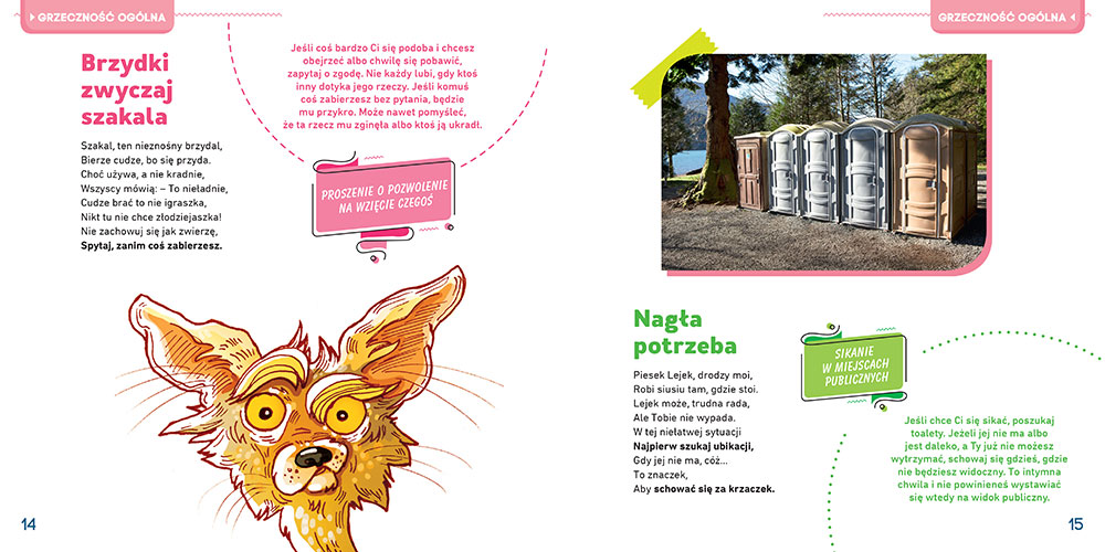 Każdy wierszyk opatrzony jest kolorową ilustracją bądź zdjęciem oraz krótkim komentarzem z wyjaśnieniem nie tylko, jak się należy zachowywać, ale również dlaczego tak, a nie inaczej. Świetny pomysł z dodaniem tych komentarzy, bowiem jeszcze bardziej utrwalają one dzieciom właściwe wzorce postępowania. Dodatkowo komentarze te mogą być świetnym wstępem do dalszych rozmów.
