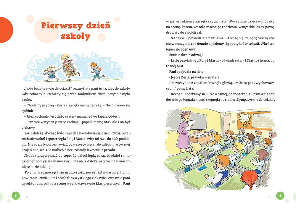 Przedstawiamy zbiór krótkich opowiadań przeznaczony dla przedszkolaków i zerówkowiczów - czyli dzieci niedługo zaczynających naukę - oraz dla uczniów klas 1-3, których szkolna przygoda trwa w najlepsze. Przez uczniowską codzienność młodych czytelników przeprowadzą bliźniaki - Staś i Zuzia oraz niezawodna i sympatyczna nauczycielka, pani Ania. Razem z nimi można przeżyć emocjonujący początek roku szkolnego, ślubowanie pierwszoklasistów, wycieczki i święta, a także obserwować bardziej zwyczajne dni uczniów i śledzić ich losy - to, jak powoli coraz lepiej są poznają i zawierają przyjaźnie.