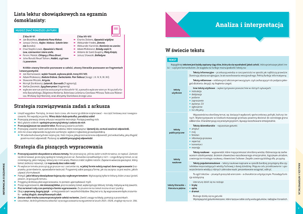 Przedstawiamy najlepszą książkę dla każdego ósmoklasisty, który chce szybko, sprawnie i skutecznie przygotować się do egzaminu kończącego szkołę podstawową. Książka zawiera cały wymagany na egzaminie materiał - omówienia lektur obowiązkowych z klas 7-8, dział dotyczący form pisemnych z przykładami, jak powinny wyglądać wypracowania, a także część językową.