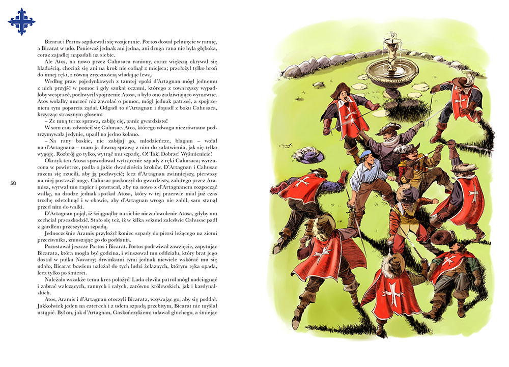 Bohaterom nie mam nic, zupełnie nic do zarzucenia. Dają się lubić, ale są też czarne charaktery, które cóż, muszą w dobrej powieści być. Najważniejsze jest to, że Aleksander Dumas wykreował sporo barwnych, ciekawych osobistości, które wkomponował w całą akcję wprost idealnie. Dlatego Trzech muszkieterów czyta się z wielkim zaangażowaniem, a nie z totalną obojętnością. Kibicujemy bohaterom, przeżywamy ich rozterki, cieszymy się z odniesionych sukcesów. To lubię i tego szukam w kolejnych powieściach, które poznaję. Na szczególne uznanie zasługuje wydanie dzieła. Wydawnictwo Greg wykonało kawał dobrej roboty! Książka jest według mnie przepiękna. Ma dużą czcionkę, są też kolorowe ilustracje. Wielkie brawa dla wydawcy!