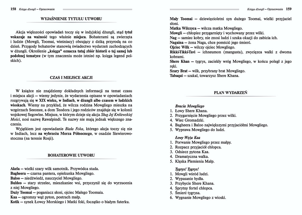 Kolejne opowiadania stanowią odrębne całości: Biała foka to historia Kotiki, foki poszukującej bezpiecznego miejsca dla swoich współbraci; Rikki-Tikki-Tavi to opowieść o ichneumonie, małym zwierzęciu świetnie polującym na węże. Toomai, Druh Słoni to historia człowieka, który dzięki miłości do zwierząt ujrzał wyjątkowe zjawisko tańca słoni. Ostatnie opowiadanie, Słudzy Jej Królewskiej Mości, mówi o zwierzętach wykorzystywanych jako środek transportu przez brytyjską armię i zmuszanych do udziału w bitwach.
