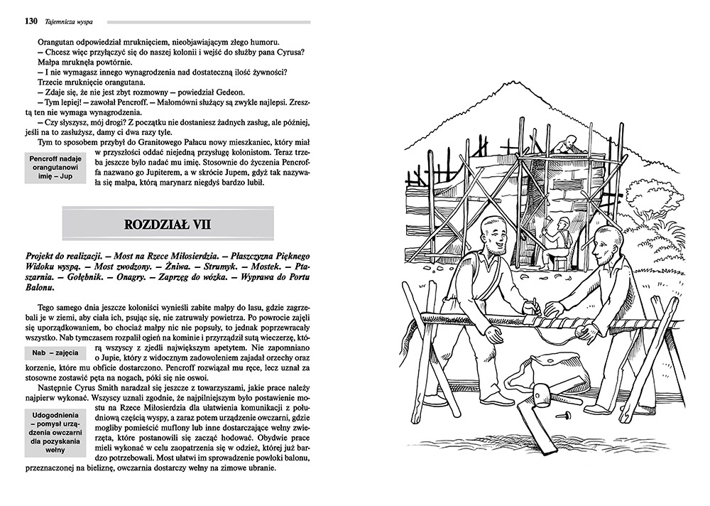 • XIX. Plany Cyrusa. - Fasada Granitowego Pałacu. - Drabina sznurowa. - Marzenia Pencroffa. - Aromatyczne zioła. - Królikarnia. - Doprowadzenie wody do nowego mieszkania. - Widok z okien Granitowego Pałacu.