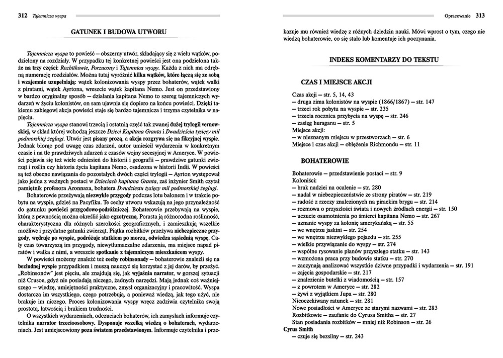 Wydanie Tajemniczej wyspy kompletne bez skrótów i cięć w treści. W tym wydaniu znajdziesz odpowiedzi na pytania z podręcznika - „pewniak na teście”, czyli wskazanie zagadnień, które zwykle pojawiają się w pytaniach z danej lektury we wszelkich testach sprawdzających wiedzę, a także w podręcznikach i na klasówkach. Książka zawiera pełen tekst lektury. Na końcu książki zamieszczono opracowanie, w którym znajduje się bardzo szczegółowe streszczenie oraz drugie skrócone, ułatwiające szybkie przygotowanie się przed lekcją. Opracowanie zawiera ponadto plan wydarzeń, wnikliwie wyjaśnioną problematykę oraz szerokie charakterystyki bohaterów.