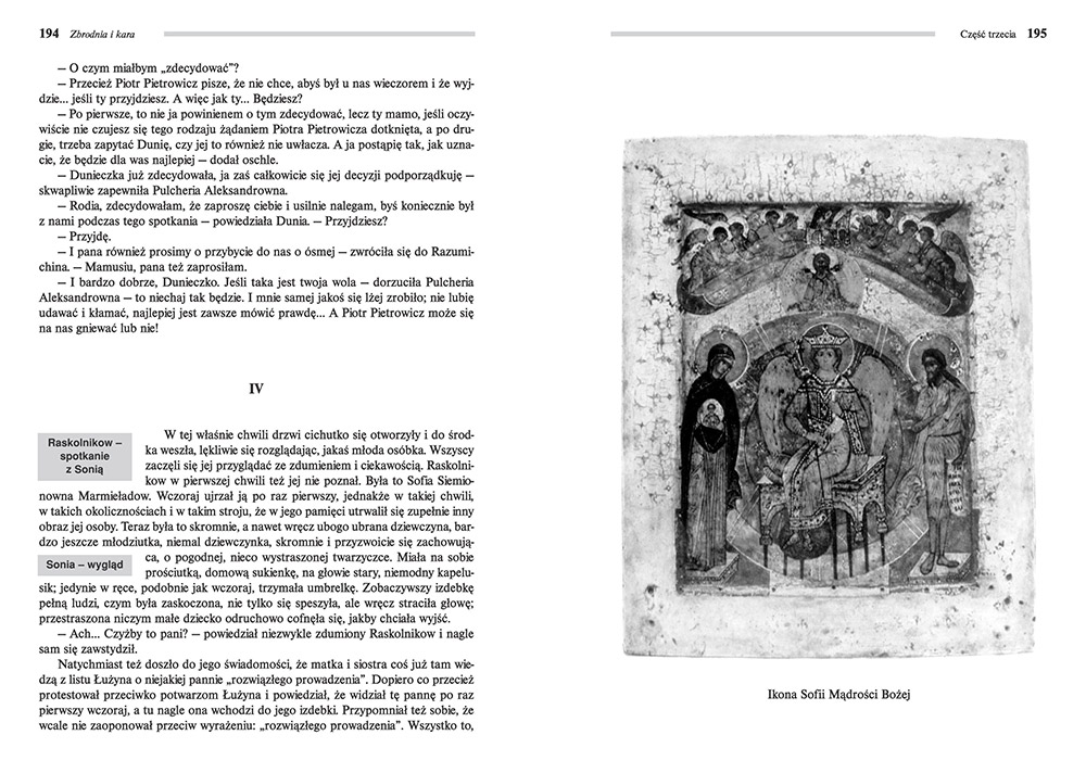 Wspaniała książka, łamiąca stereotyp długiej i nudnej lektury, którą należy jak najszybciej przeczytać, żeby mieć ją z głowy. To bardzo dobra i mądra książka opowiadająca o smutnych realiach rosyjskiego społeczeństwa. Ukazuje całą panoramę społeczną Petersburga - miasta, gdzie jedni giną w przepychu a inni z głodu. Szczególnie ciekawy jest wątek młodej kobiety, Sonii, która wybiera drogę prostytutki, aby móc utrzymać ojca i rodzeństwo. Doskonale ukazany jest proces zbrodni, która, jako haniebny czyn zawsze wychodzi na jaw. Wydanie książki jest bardzo dobre a czcionka jest idealna do szybkiego czytania. Zawiera również streszczenie i najważniejsze informacje, przydatne na lekcję języka polskiego. Na stałe zawitała do mojej domowej biblioteczki i bardzo chętnie do niej wracam. Warto byłoby popracować nad okładką. Nie nadaje się dla młodszych czytelników ponieważ trzeba dojrzeć, aby zrozumieć treść. Polecam!