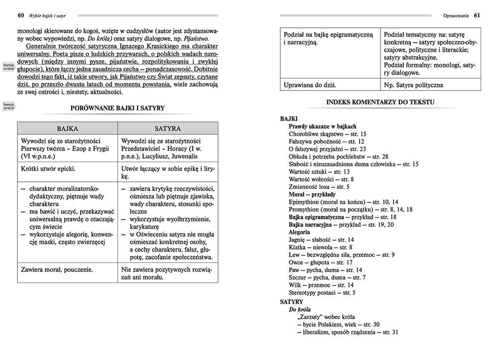 Wydanie Wyboru bajek i satyr kompletne bez skrótów i cięć w treści. W tym wydaniu znajdziesz odpowiedzi na pytania z podręcznika - „pewniak na teście”, czyli wskazanie zagadnień, które zwykle pojawiają się w pytaniach z danej lektury we wszelkich testach sprawdzających wiedzę, a także w podręcznikach i na klasówkach. Książka zawiera pełen tekst lektury. Na końcu książki zamieszczono opracowanie, w którym znajduje się bardzo szczegółowe streszczenie oraz drugie skrócone, ułatwiające szybkie przygotowanie się przed lekcją. Opracowanie zawiera ponadto plan wydarzeń, wnikliwie wyjaśnioną problematykę oraz szerokie charakterystyki bohaterów.