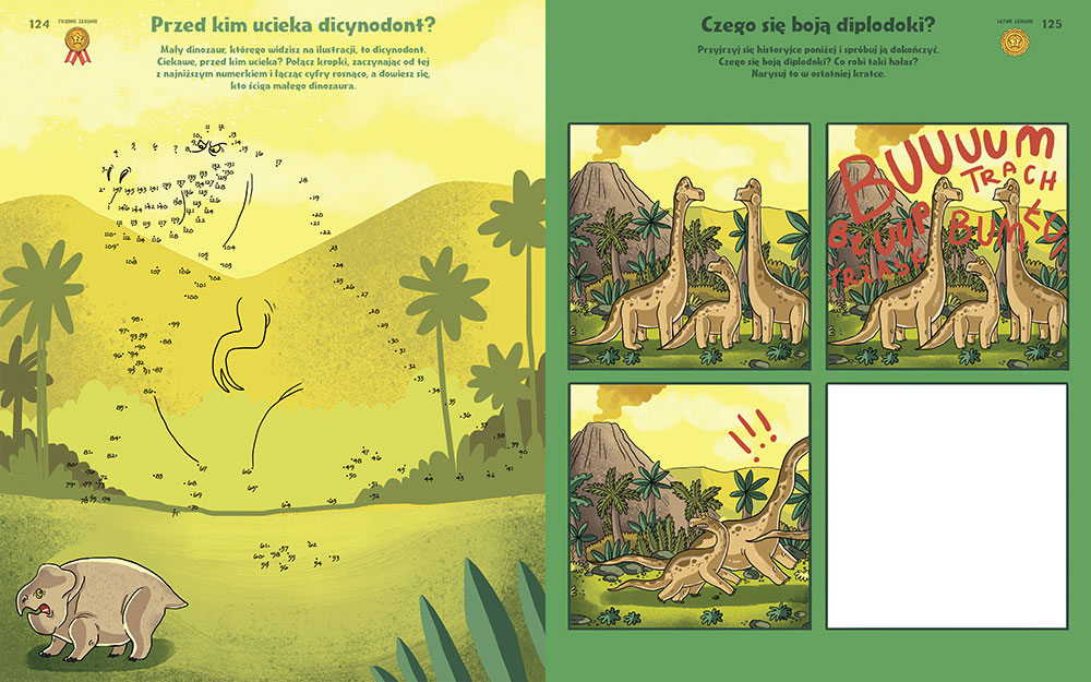 Można tu znaleźć wszystkie typy zabaw ulubione przez dzieci - labirynty, szukanie różnic, łączenie par, dobieranie pasujących elementów, rysowanie i kolorowanie, a także krzyżówki, łamigłówki logiczne i szyfry. Zadania prezentują trzy stopnie trudności, a więc każde dziecko znajdzie coś dla siebie. A wszystko to w oszałamiającej rozmachem i kolorami oprawie graficznej przygotowanej przez niezrównaną graficzkę, Nikolę Kucharską.