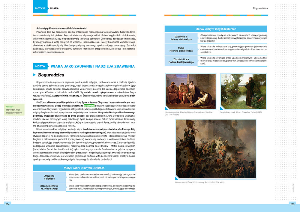Orientacja w lekturach i sprawne pos³ugiwanie siê swoj± wiedz± wymaga nie tylko znajomo¶ci tre¶ci, ale przede wszystkim problematyki. Od przysz³ego maturzysty wymagana jest umiejêtno¶æ przyporz±dkowywania utworów do zwi±zanych z nimi motywów literackich, budowania skojarzeñ i dobierania kontekstów. Dlatego te¿ Kompendium... to ksi±¿ka, która prezentuje lektury z podstawy programowej wed³ug motywów, k³ad±c nacisk na zupe³nie inne aspekty, ni¿ tradycyjne pomoce edukacyjne. Dziêki niej mo¿na nauczyæ siê problemowego analizowania utworów, szybkiego wybierania potrzebnych do danego tematu lektur, a tak¿e swobodnego operowania skojarzeniami i nawi±zaniami. S± tutaj te¿ charakterystyki bohaterów i streszczenia (a ich d³u¿sze wersje mo¿na znale¼æ pod kodami QR).